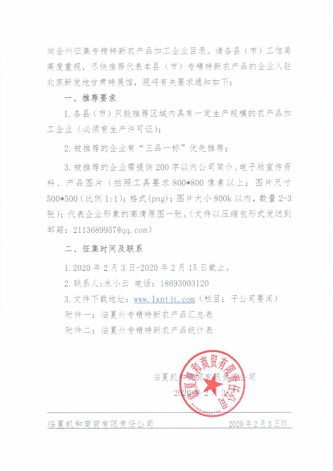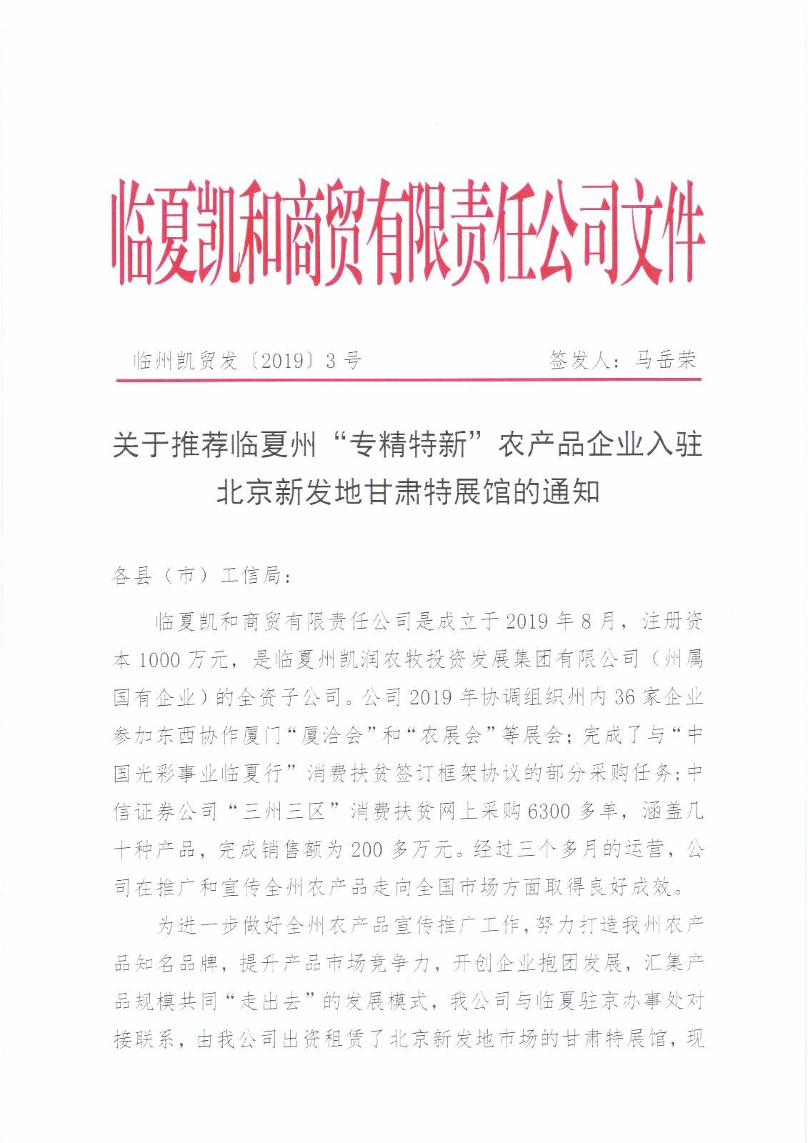 關于推薦臨夏州“專精特新”農產品企業入駐北京新發地甘肅特展館的通知.pdf